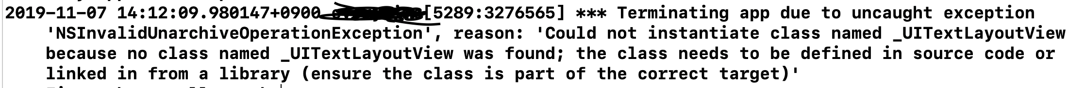 *** Terminating app due to uncaught exception 'NSInvalidUnarchiveOperationException', reason: 'Could not instantiate class named _UITextLayoutView because no class named _UITextLayoutView was found; the class needs to be defined in source code or linked in from a library (ensure the class is part of the correct target)'