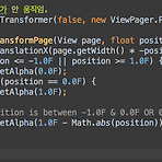 mViewPager.setPageTransformer(false, new ViewPager.PageTransformer() { @Override public void transformPage(View page, float position) { page.setTranslationX(page.getWidth() * -position); if(position = 1.0F) { page.setAlpha(0.0F); } else if( position == 0.0F ) { page.setAlpha(1.0F); } else { // position is between -1.0F & 0.0F OR 0.0F & 1.0F page.setAlpha(1.0F - Math.abs(position)); } } }); 출처 : ..
